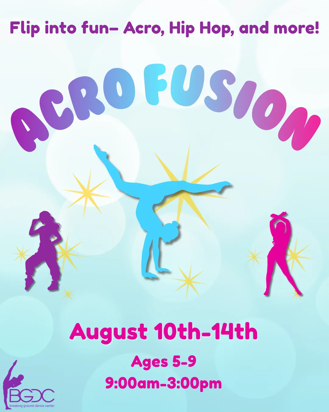 Flip, tumble, and groove at Acro Fusion! Spend the week at BGDC perfecting your acro skills alongside other dance styles. With a mix of movement & creativity, get ready to level up your tricks, moves, and your confidence for the fall!