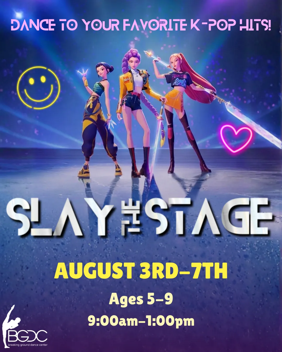 Can't get enough of K-Pop Demon Hunters?Slay the Stage is your dancer's moment to shine! Step into the spotlight to learn choreography to popular Huntrix and Saja Boy hits, play energetic games, and create a fun themed craft!