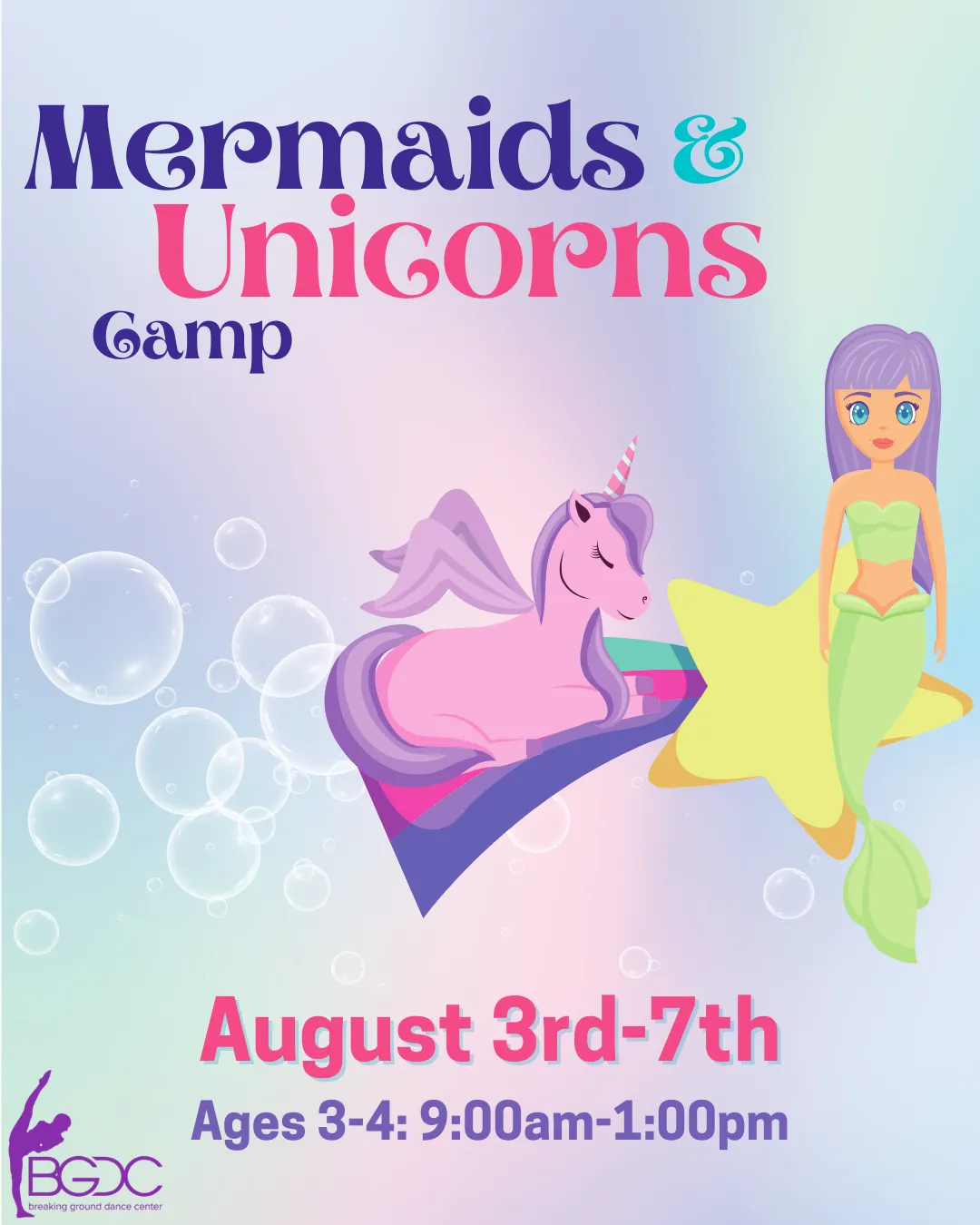 Splash into a magical adventure at a BGDC classic– Mermaids & Unicorns dance camp! Move & groove with graceful mermaids and unicorns in a week full of enchanting crafts, dance, and so much more!