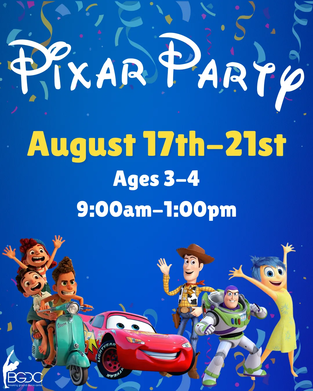 It's a Pixar Party! From Toy Story to Luca to Finding Nemo, campers will dance along to popular Pixar stories. It’s a week of animated adventures, storytelling, and movement- perfect for every little Pixar fan!
