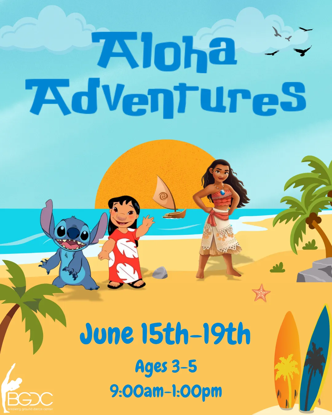 Dive into a week of tropical fun at Aloha Adventures! Kids will enjoy beach-themed crafts, movement games, while exploring the worlds of Lilo & Stitch, Moana, and more, letting their playful imagination soar!